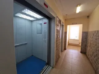 The apartment is located in a well-maintained residential complex with both freight and passenger elevators, secure access, and nearby surface parking.