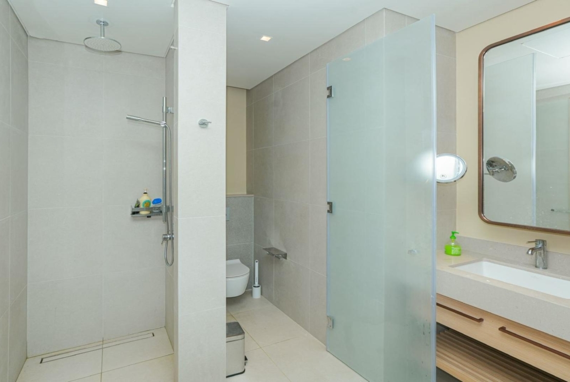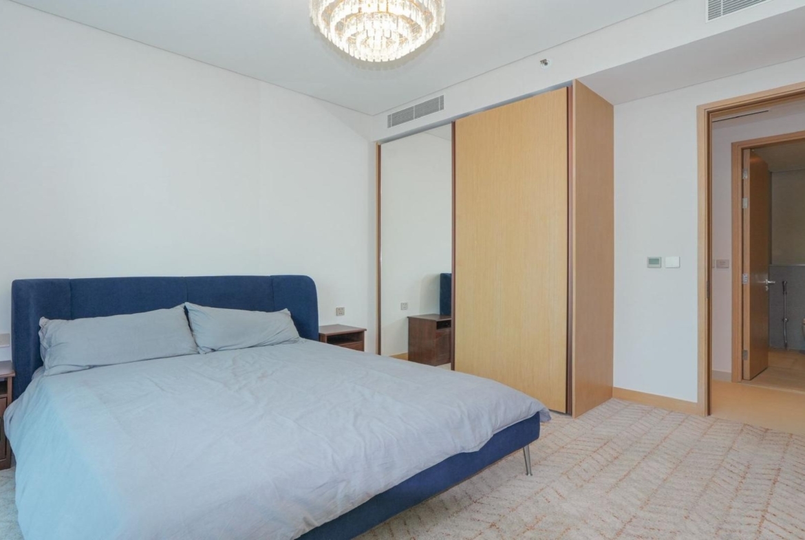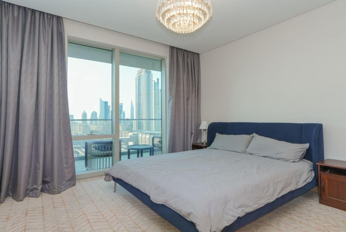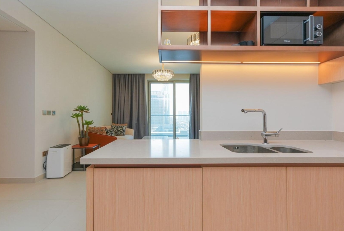 Both bedrooms are positioned for privacy, making the apartment ideal for professionals, couples, or small families. The main bedroom comfortably fits a full-sized bed and furniture, while still feeling uncluttered. Waking up to Downtown Dubai views instead of neighboring walls is a luxury you notice every day.