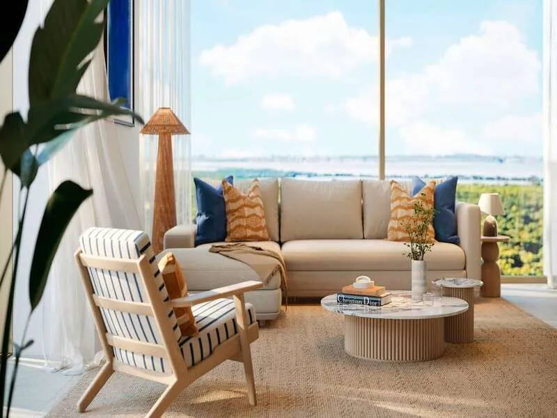 Expansive floor-to-ceiling windows fill the apartment with natural light while showcasing panoramic beach and island views perfect for those seeking both relaxation and sophistication.