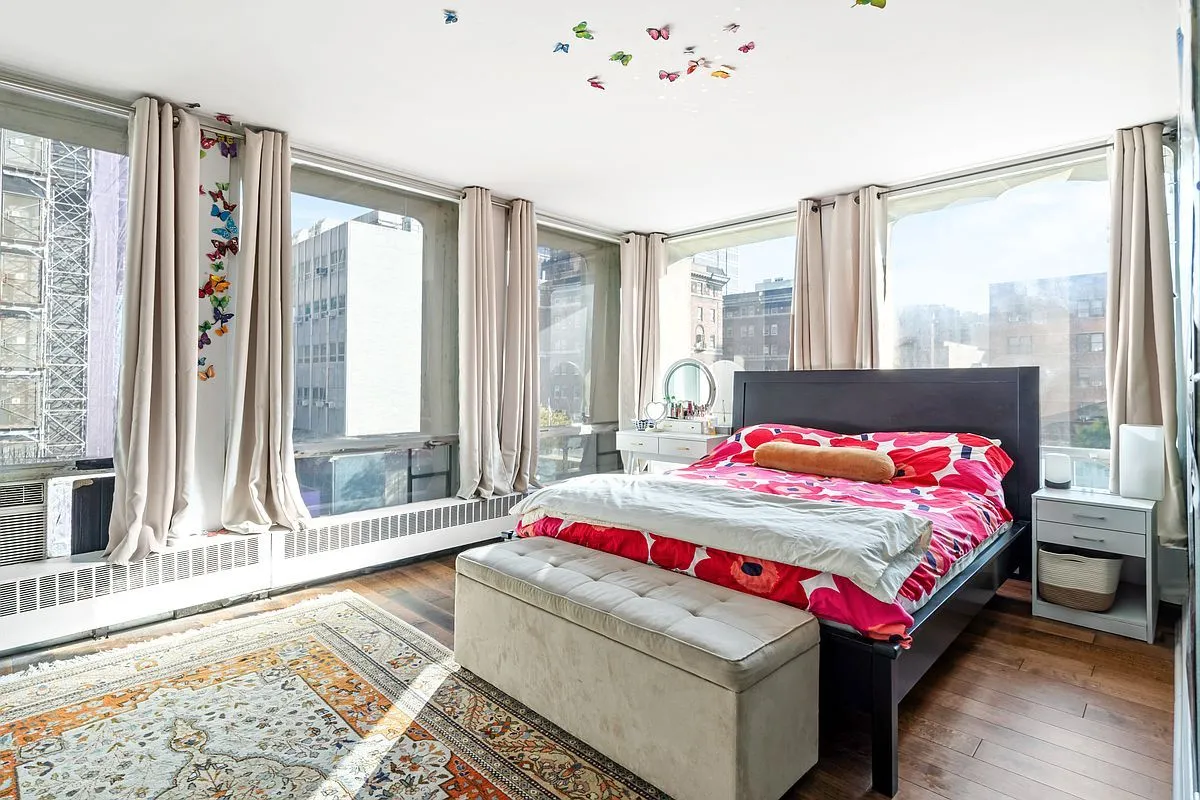 This sun-filled residence features over 65 linear feet of nearly floor-to-ceiling windows, flooding the interiors with natural light and framing breathtaking city and skyline views. Spanning 1,095 sq. ft., the home showcases wide-plank hardwood floors, a spacious open-plan living and dining area, and a state-of-the-art kitchen with granite countertops, Sub-Zero and Viking appliances, and an in-unit Bosch washer and dryer.