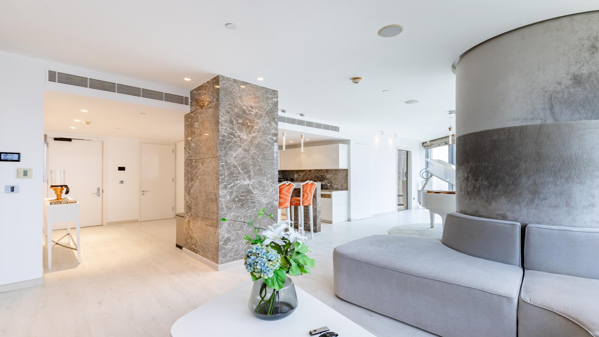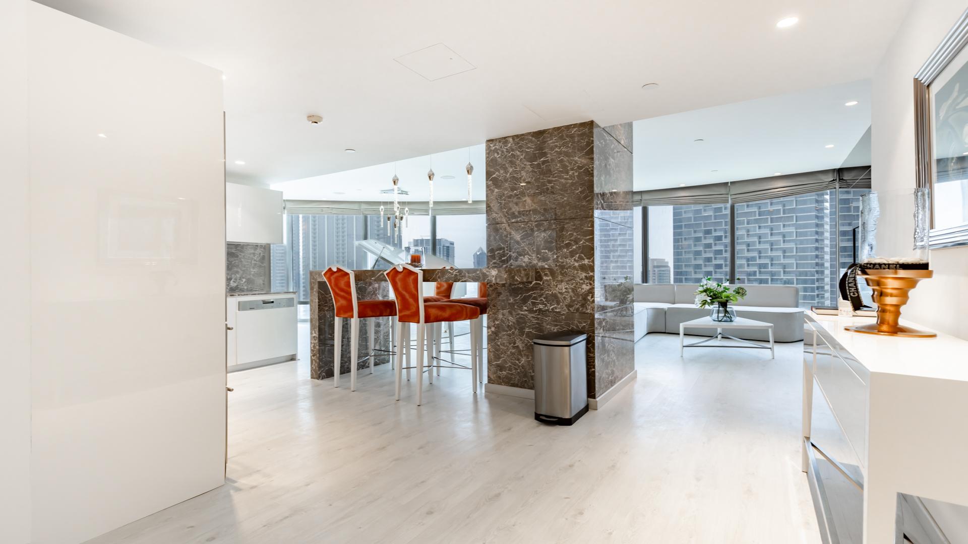 While the Burj Khalifa is known worldwide for its height and prestige, living inside the tower offers something more unexpected: calm. From the moment you step into the apartment, the floor-to-ceiling windows open up views of Downtown Dubai, creating a sense of space and quiet that feels far removed from the busy streets below.