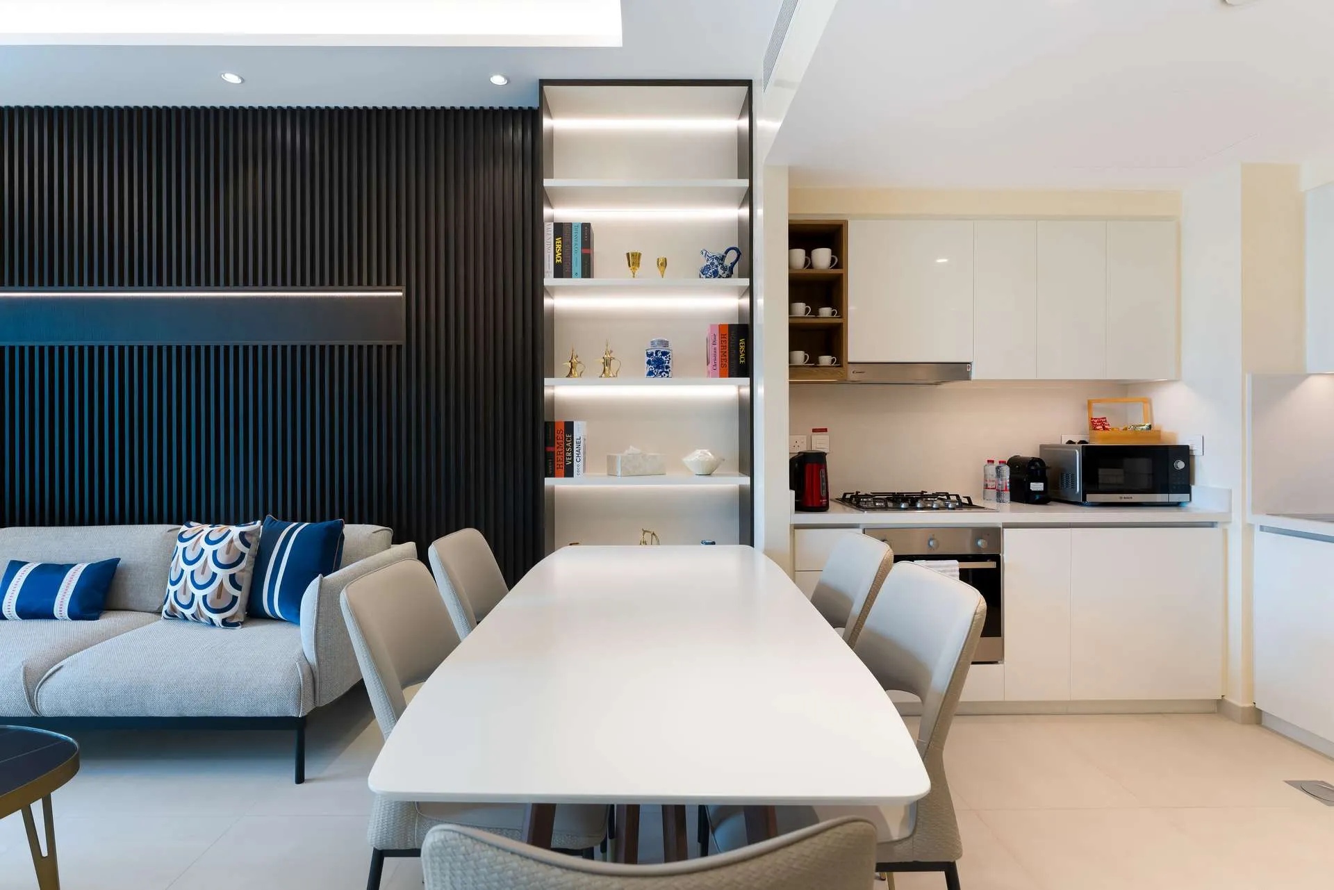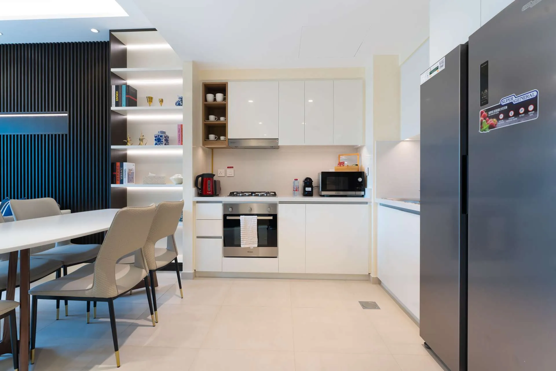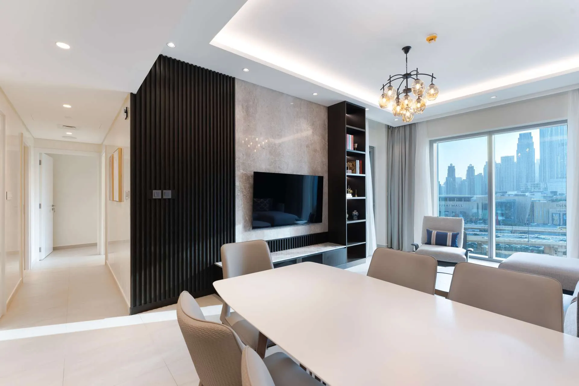 This Burj Khalifa View Apartment for Rent combines contemporary design with functional luxury. The open kitchen and living area flow seamlessly, creating a perfect space for both entertaining guests and relaxing after a long day.