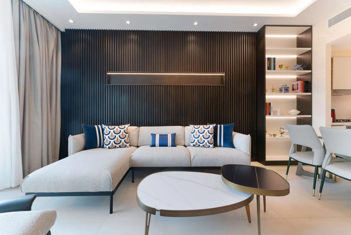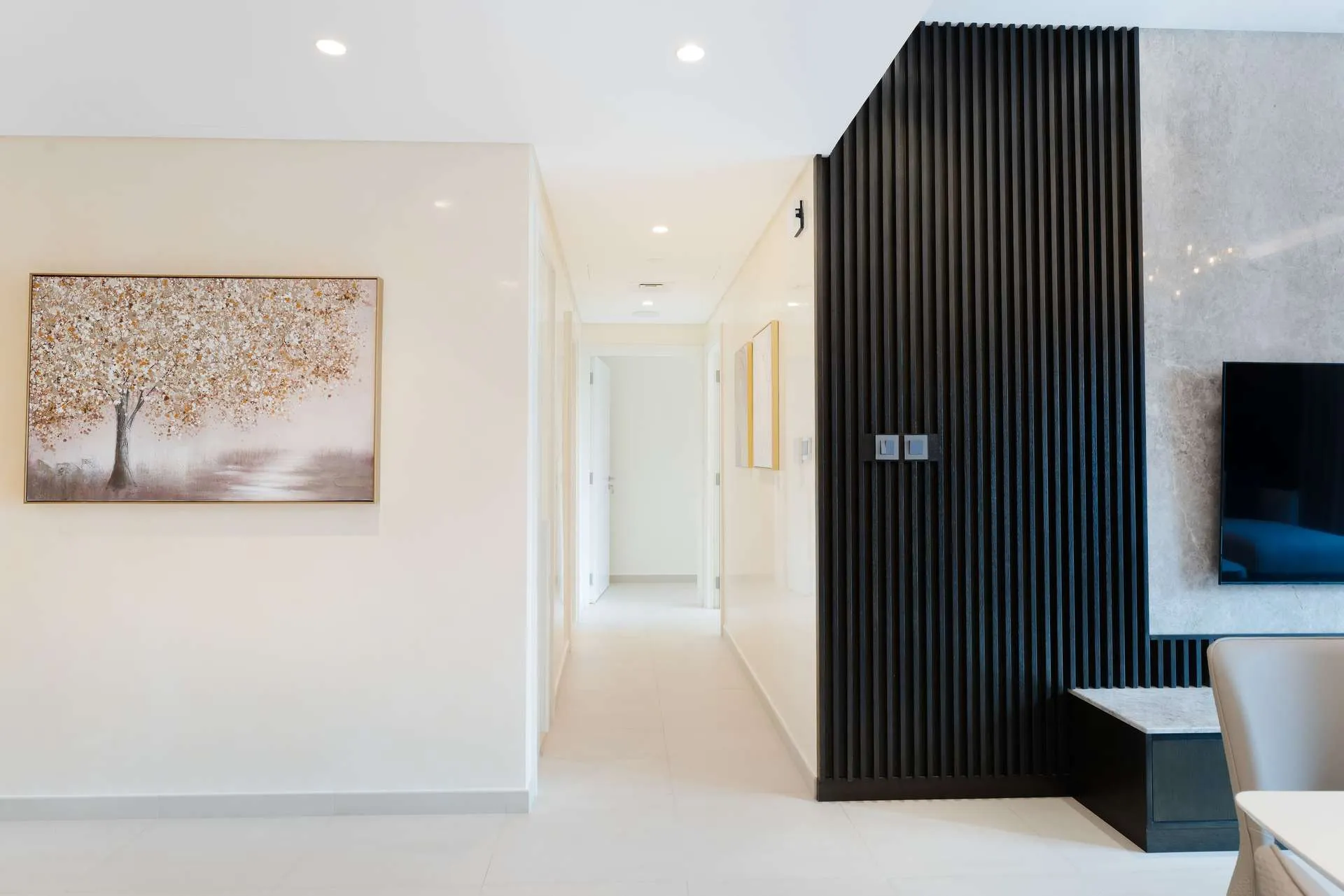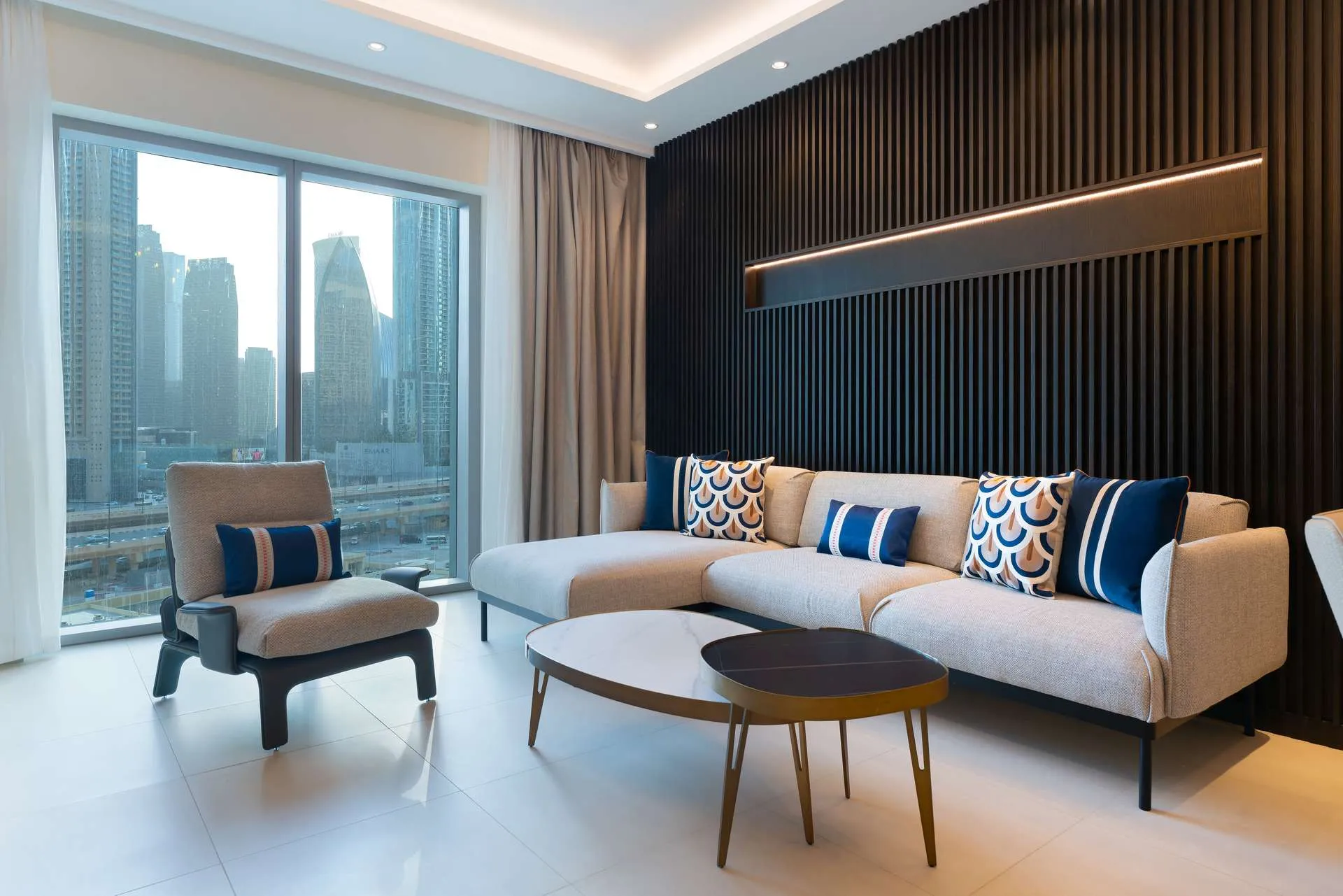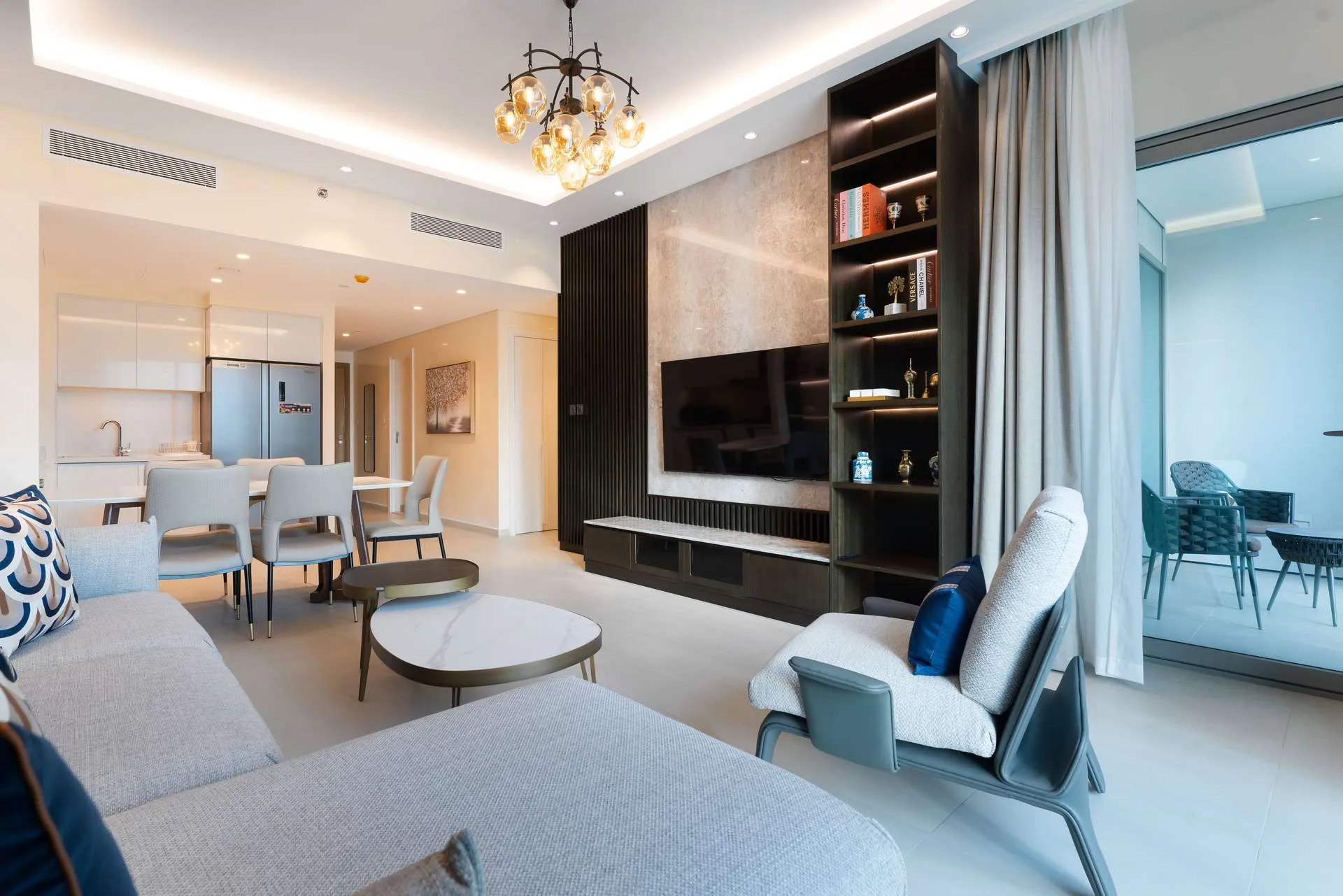 This Burj Khalifa View Apartment for Rent combines contemporary design with functional luxury. The open kitchen and living area flow seamlessly, creating a perfect space for both entertaining guests and relaxing after a long day.
