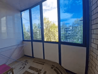 Located on the 5th floor of an 18-story monolithic brick building, the apartment has a total area of 42.7 sq.m., including a 10 sq.m. kitchen, a 24 sq.m. living room, and a 4 sq.m. glazed loggia.